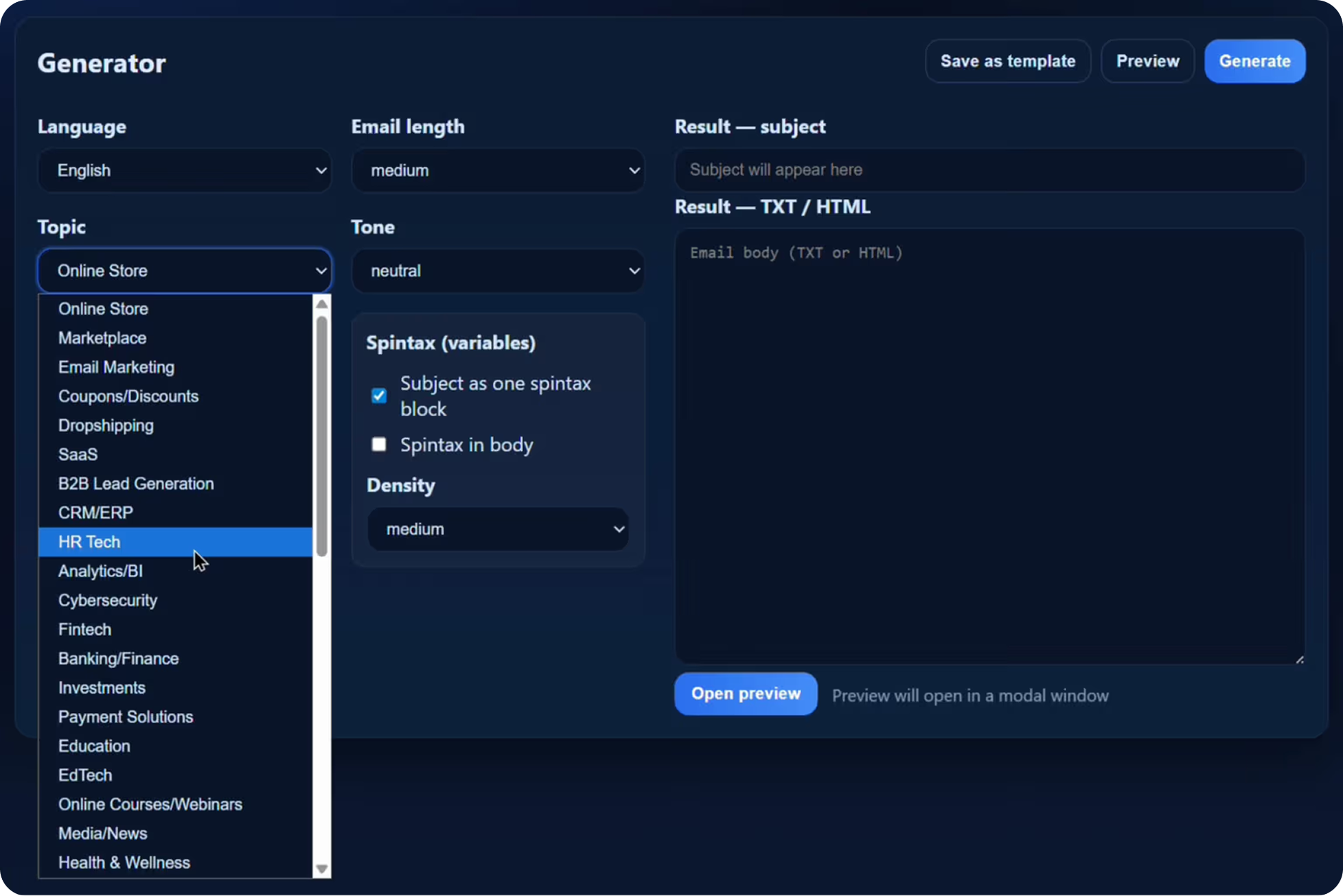 - Tone Selection: The interface supports specialized styles, such as an “expert” tone for Analytics or Business Intelligence themes, producing professional-looking emails that exploit trust in technical subject matter.