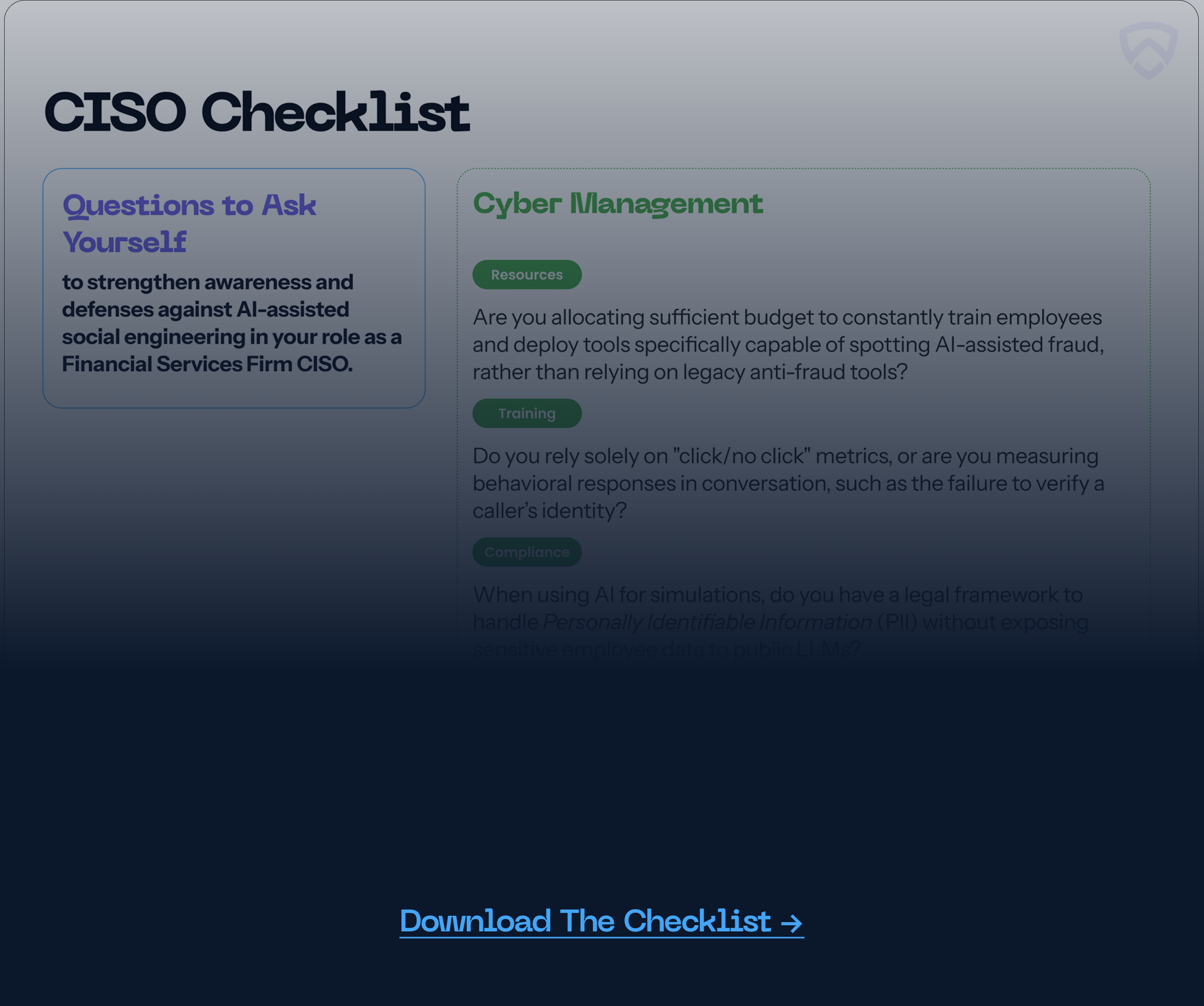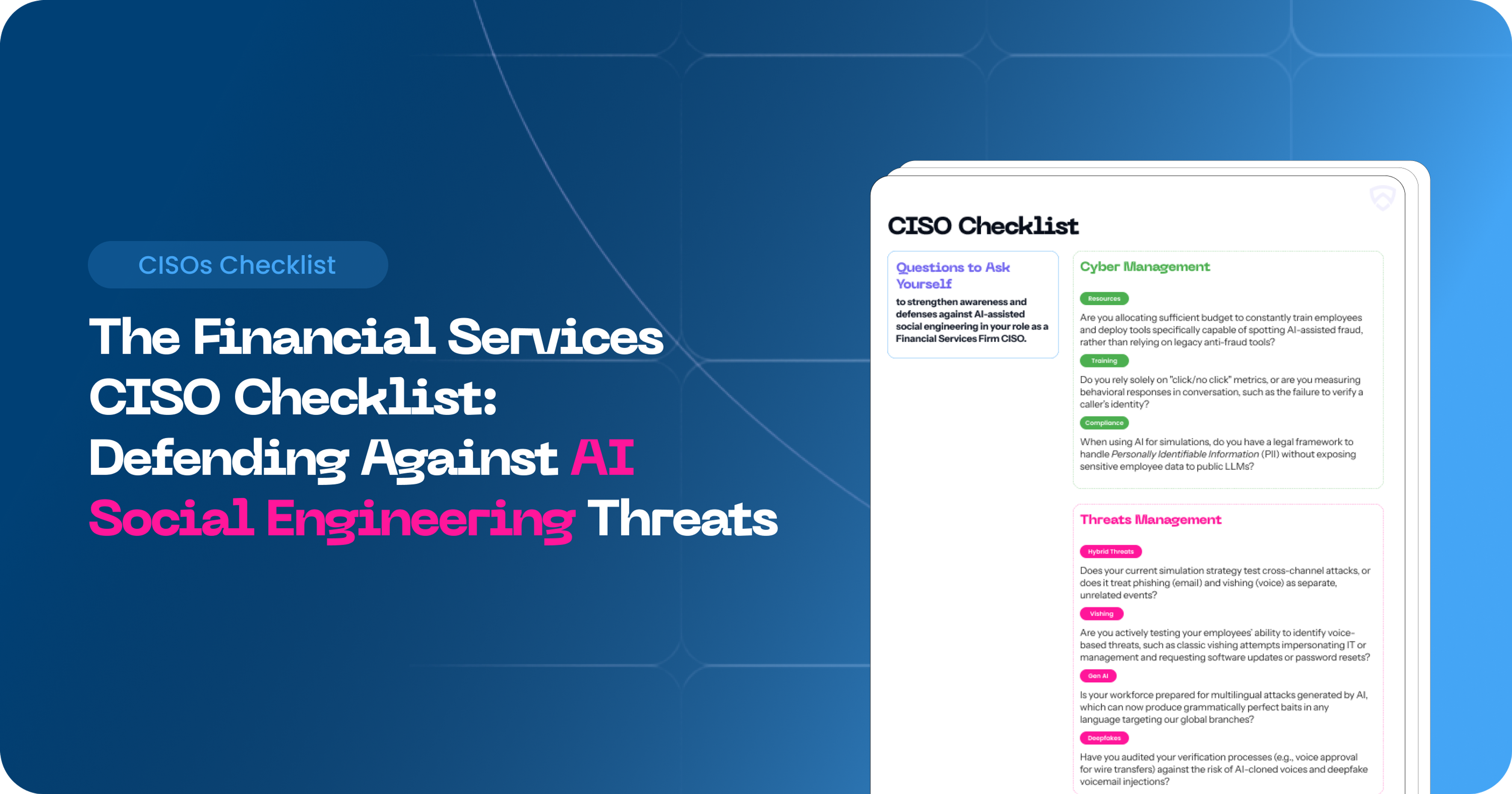 To help you do exactly that, we have put together a dedicated checklist built for financial services CISOs and cyber teams, covering the key self-assessment questions you should be asking right now, and the concrete steps to build a stronger, more resilient awareness strategy against AI-assisted social engineering. Download the checklist and start strengthening your defenses today.