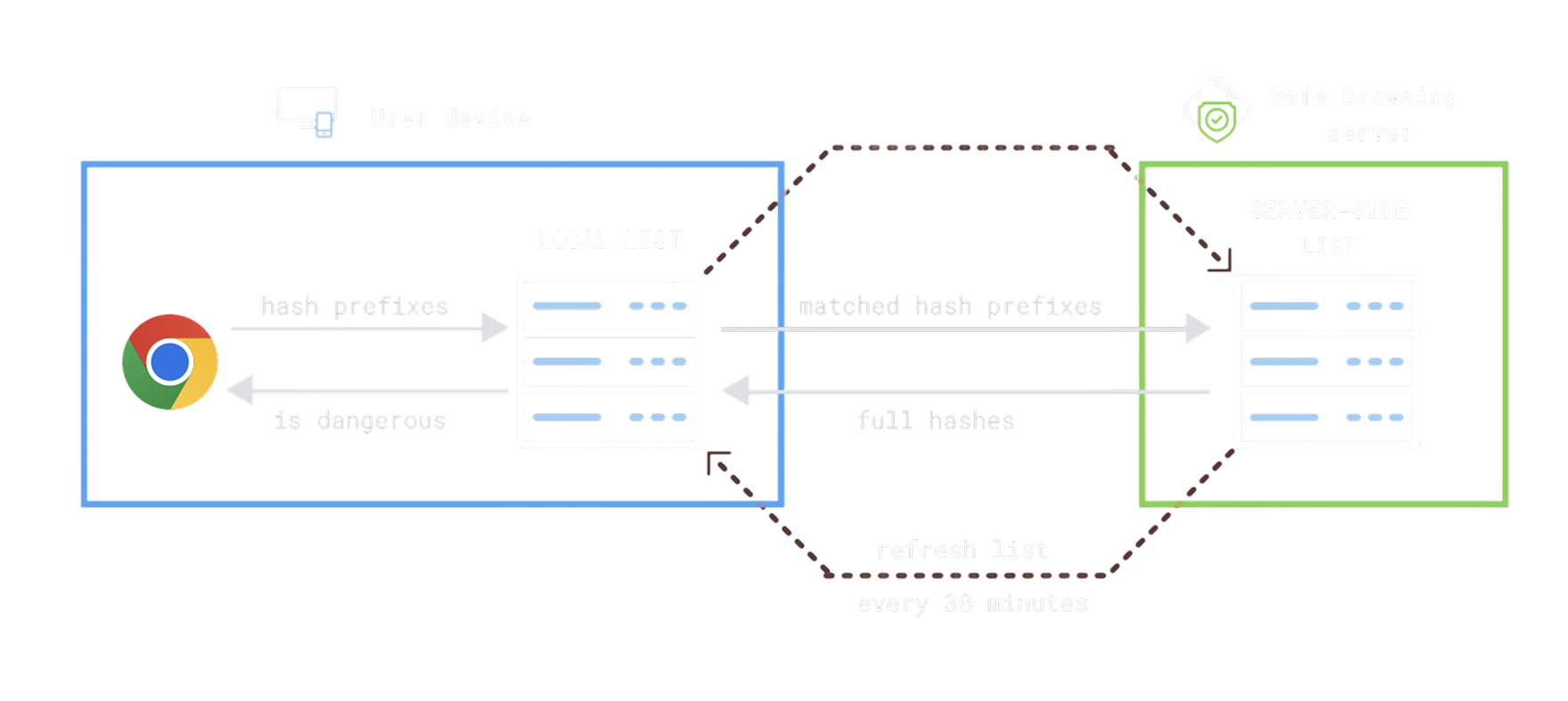 Hash Prefix Matching To protect user privacy, browsers often send a hash prefix of the URL rather than the full URL. Google then returns a list of potential full hashes to compare locally.