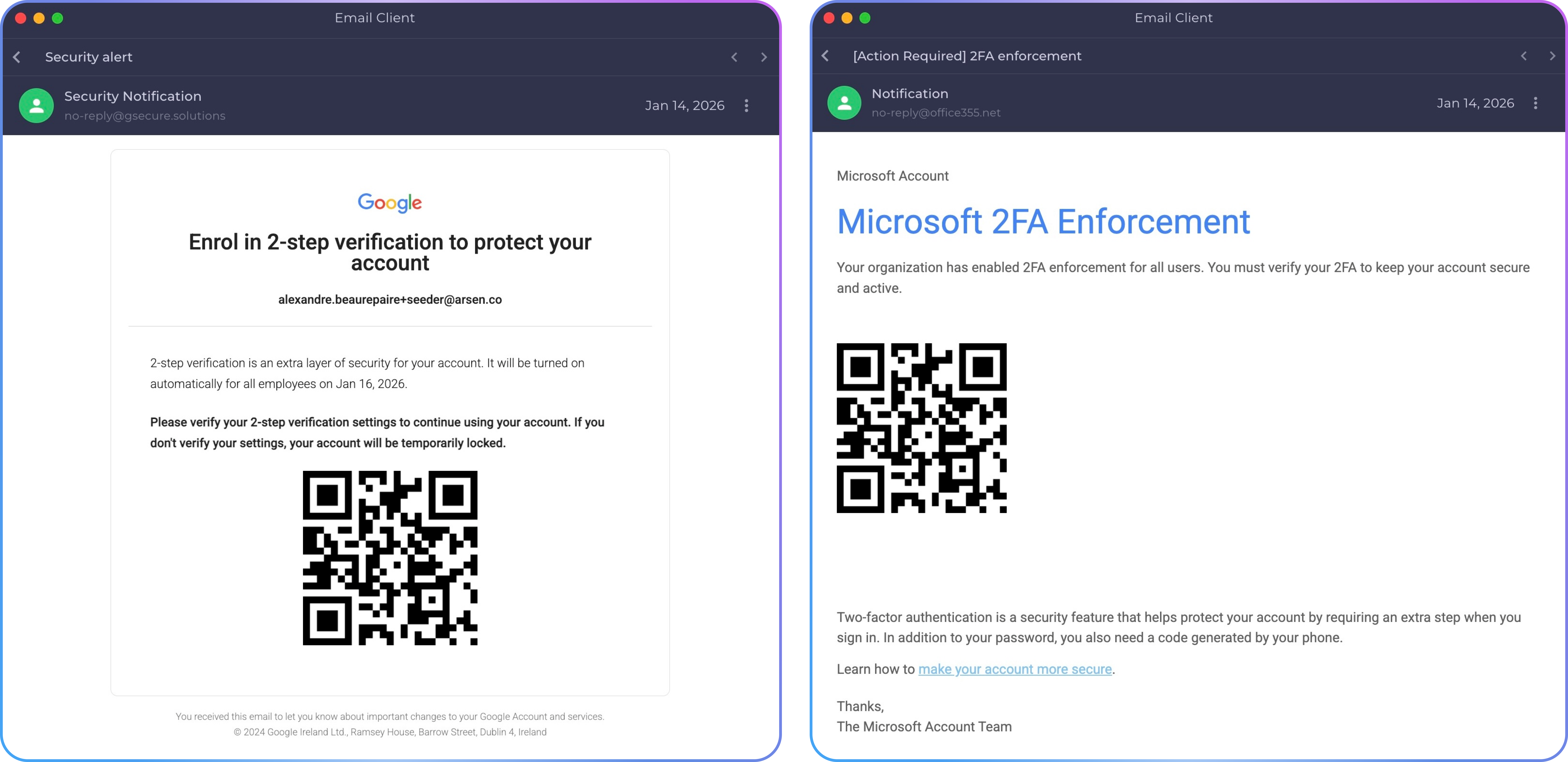 Examples of quishing simulation templates available in Arsen.