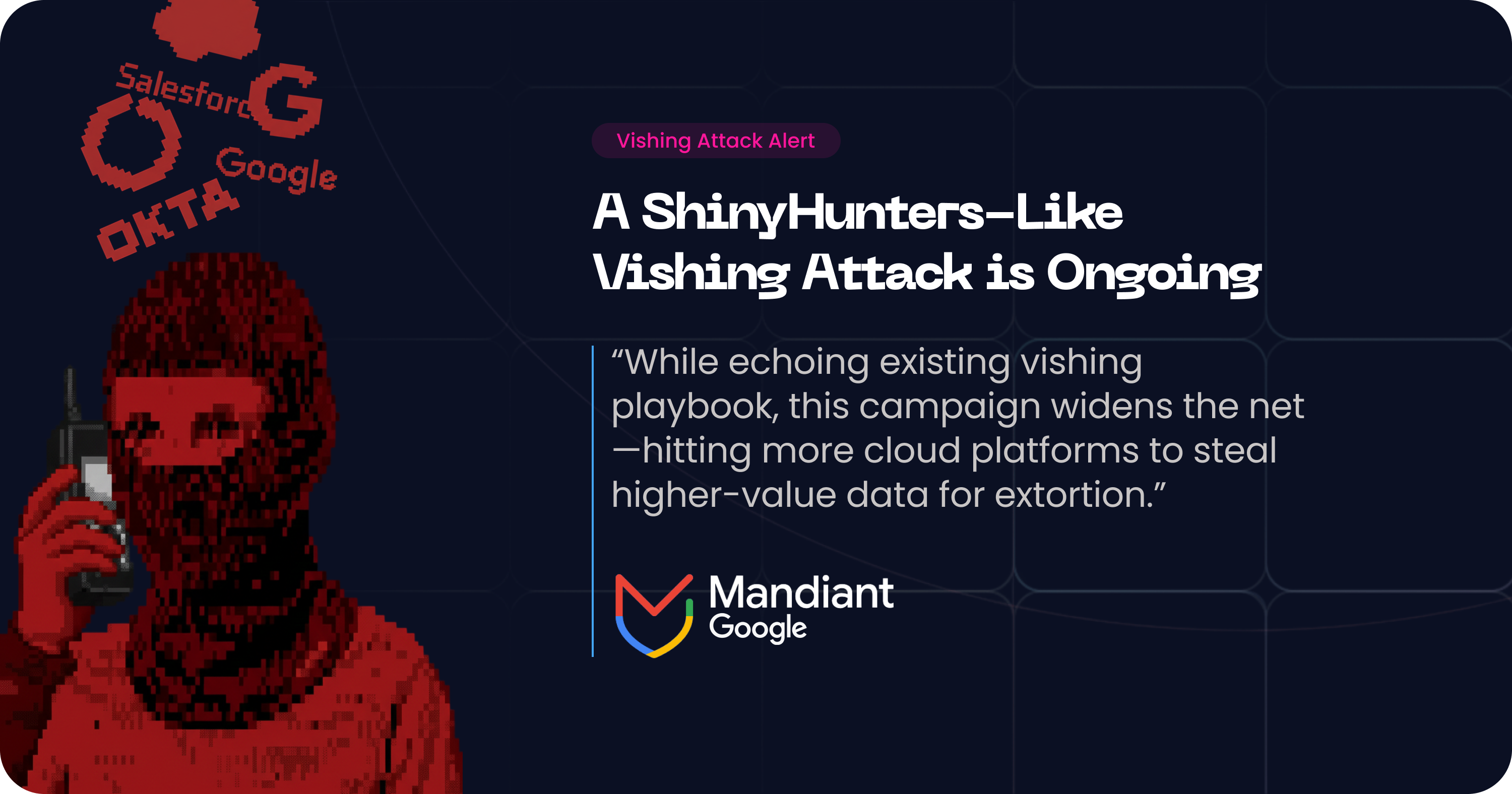 The ShinyHunters group is currently orchestrating vishing attacks and exploiting single sign-on (SSO) to bypass multi-factor authentication (MFA). These sophisticated campaigns have led to breaches of cloud platforms like Okta, Microsoft 365, and Google Workspace, resulting in significant identity theft and cloud data exfiltration. Mandiant (Google Threat Intelligence) has provided detailed insights into the group's evolving tactics.